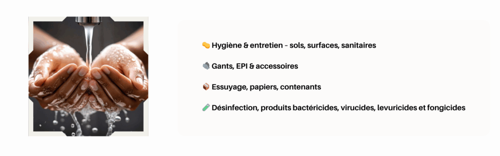 Nous proposons plus de 8 000 références en hygiène et entretien professionnel : produits de nettoyage, désinfection, entretien des sols, linge et surfaces, vaisselle jetable, gants et EPI , sacs poubelle et collecteurs de déchets.